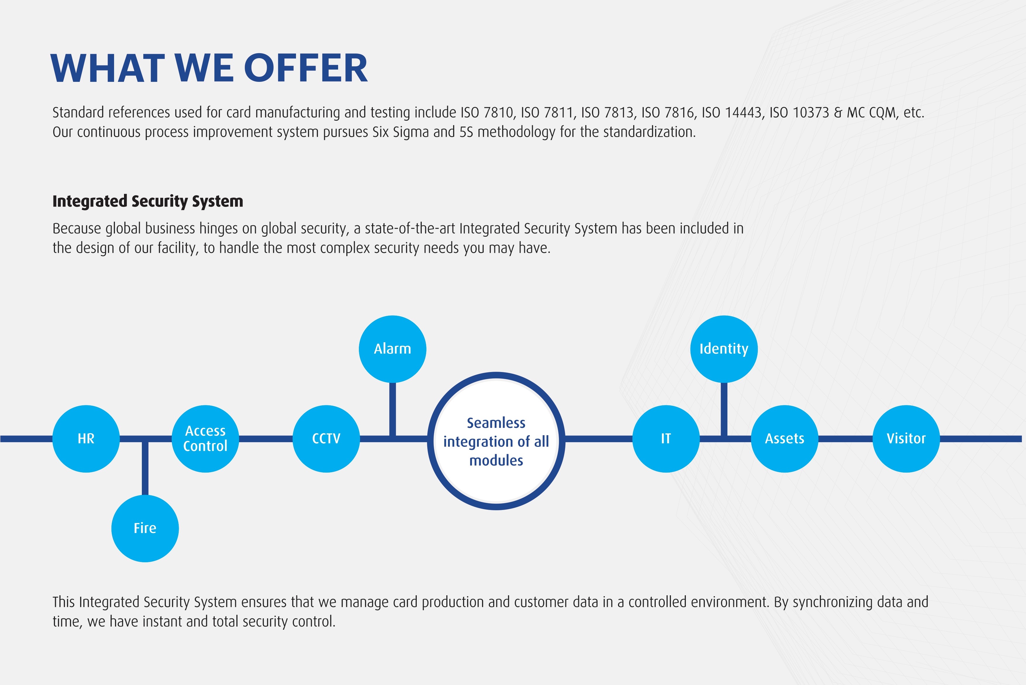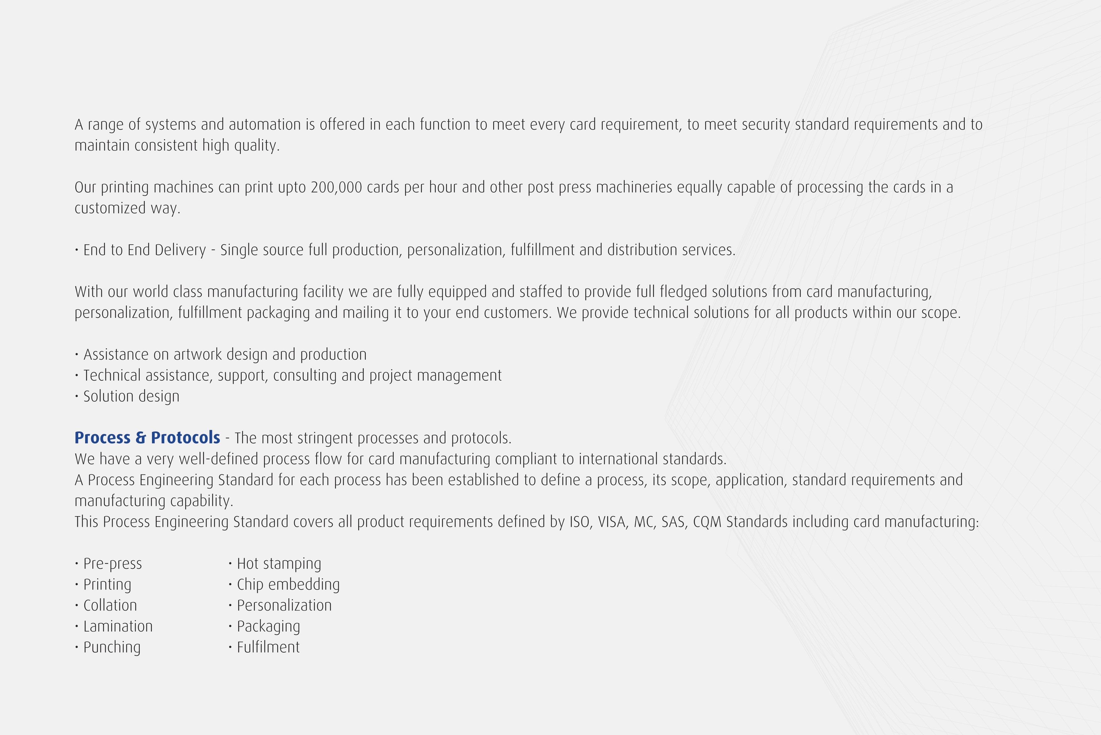 • We specialize in High Security ID cards and have therefore acquired a wealth of highly specialized technologies and production know-how, extending to the most hard-to- process materials like Polycarbonate (PC).